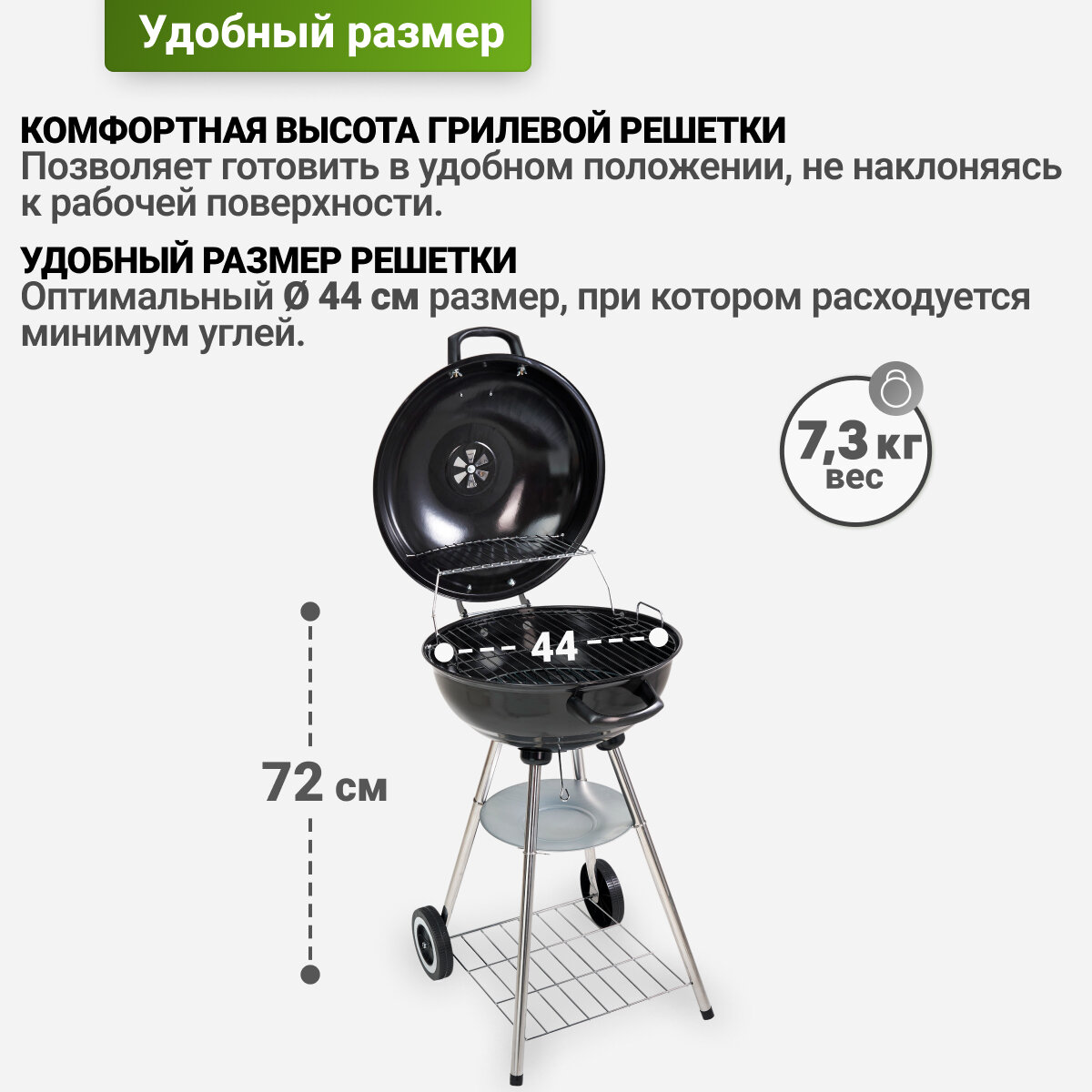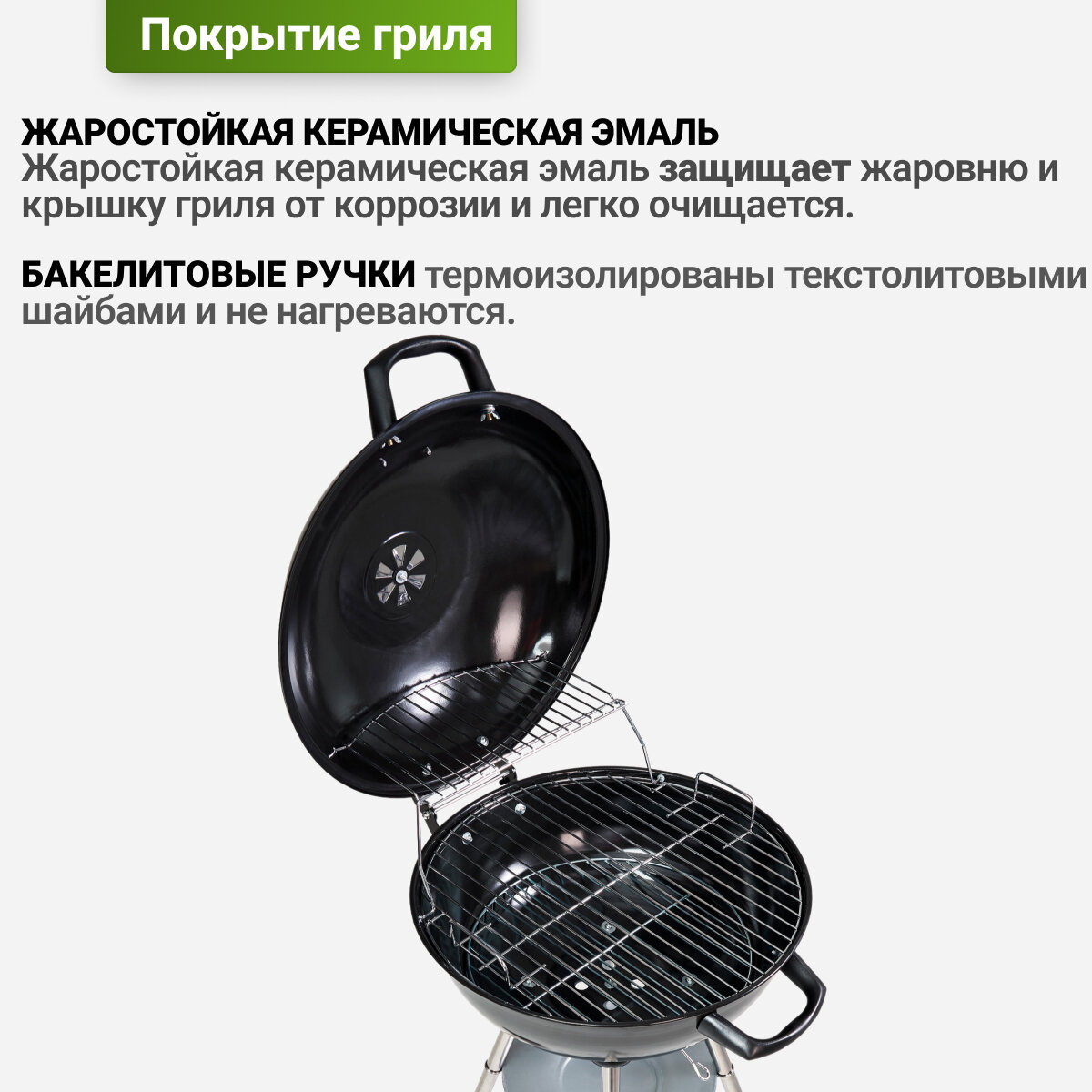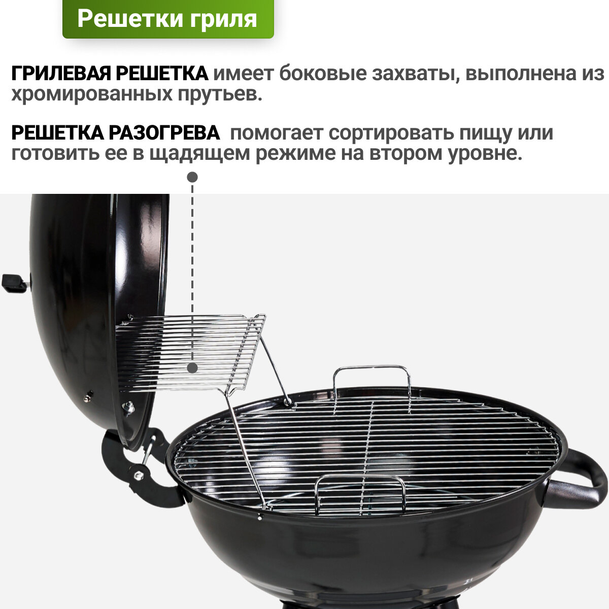 | Дополнительная информация | дополнительная решетка для разогрева; размер жаровни 47.5 см, размер грилевой решетки 43 см, высота грилевой решетки 72 см |