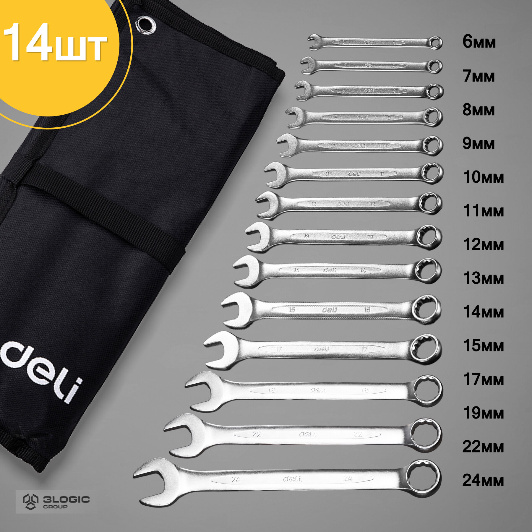 Ключи Deli Набор комбинированных гаечных ключей 14 шт Deli DL130014A (размеры 6,7,8,9,10,11,12,13 ,14,15,17,19,22,24 мм, матовая хромированн 13 464 ₽