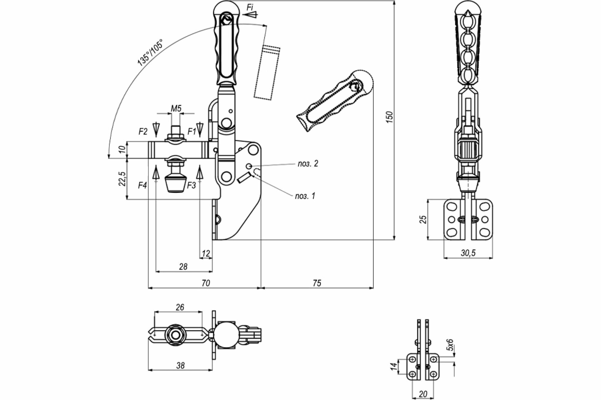 Прижим вертикальный со стопорной рукояткой KUKAMET 211-3-L, усилие 255 кг
