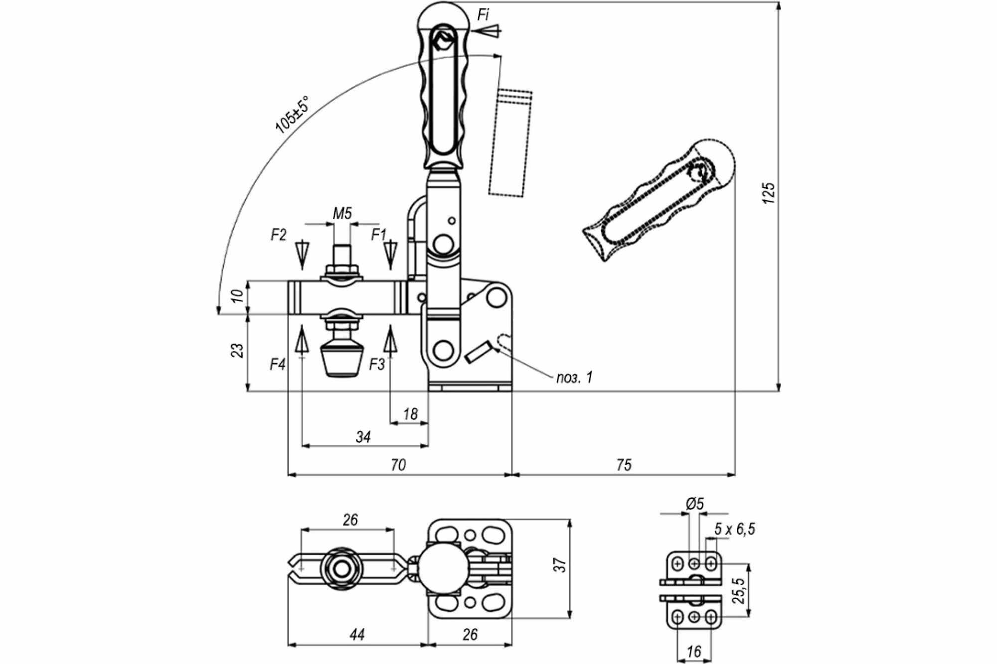 Прижим вертикальный со стопорной рукояткой KUKAMET 211-3-L, усилие 255 кг