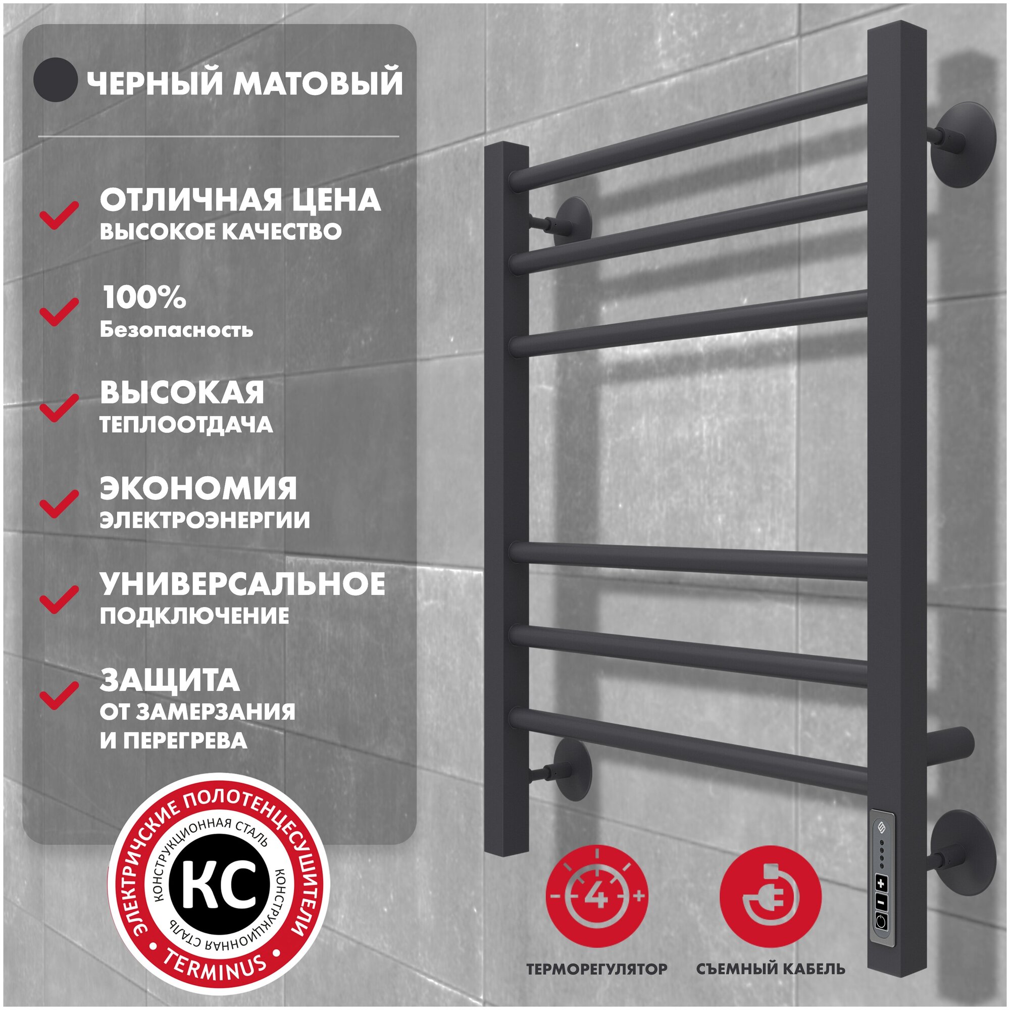 Полотенцесушитель электрический черный TERMINUS Сицилия П6 450х600 КС 9005 матовый ( new встроен диммер) КС 9005 матовый ( new встроен диммер) Полотенцесушитель TERMINUS