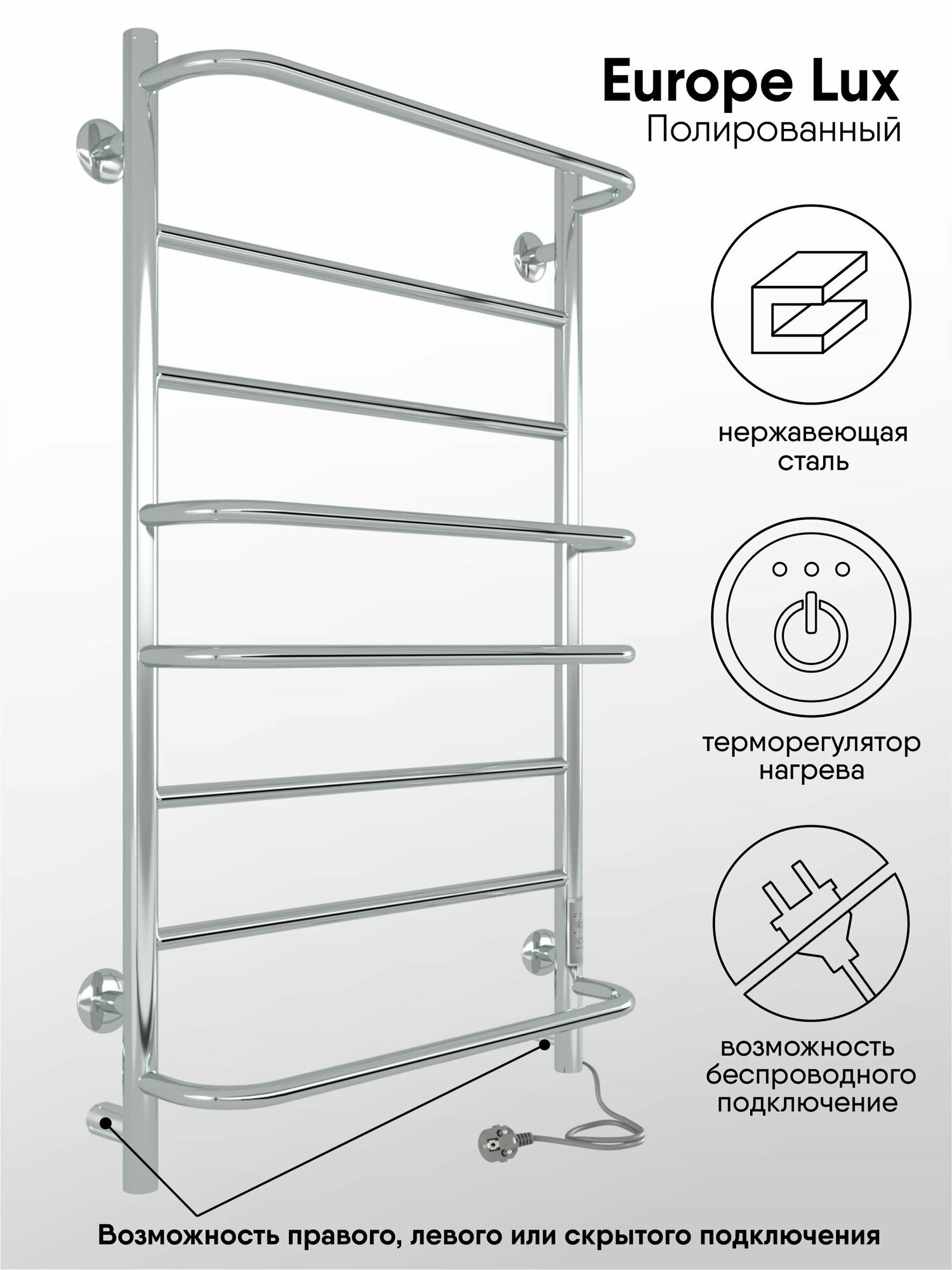 Полотенцесушитель Europe Lux электрический 80/50 таймер, скрытый монтаж, универсальное подключение, Полированный INDIGO