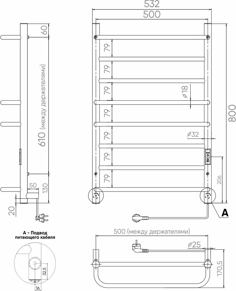 Полотенцесушитель Europe Lux электрический 80/50 таймер, скрытый монтаж, универсальное подключение, Полированный INDIGO