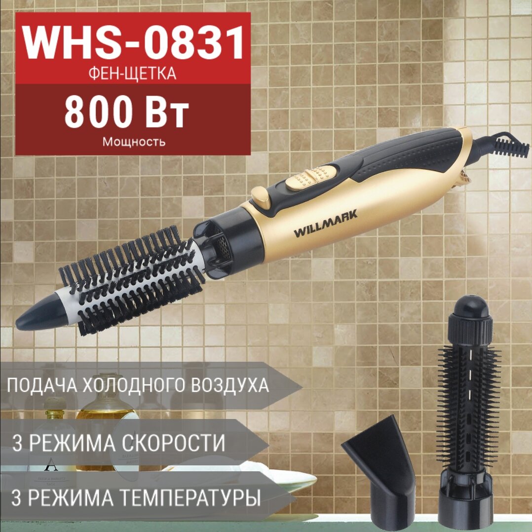 Фен-щетка WILLMARK WHS-0831 (золотой металлик, 3 насадки, 800W) 1 190 ₽