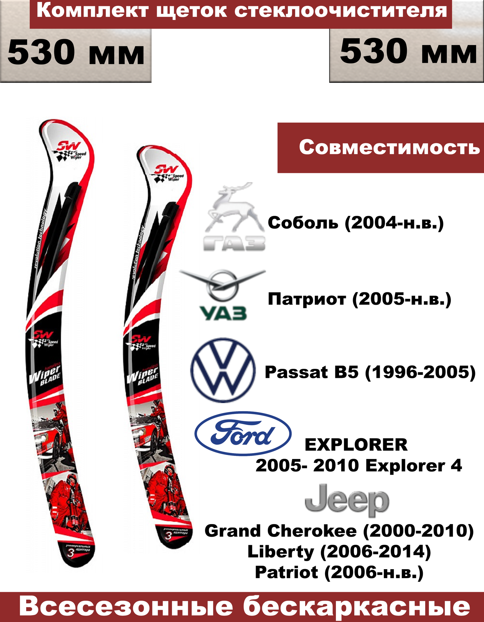 Комплект бескаркасных щеток стеклоочистителей premium (дворники) ГАЗ Соболь, УАЗ Patriot (Патриот 2005г - н.в.) - 2 шт. (водительская и пассажирская) информация: