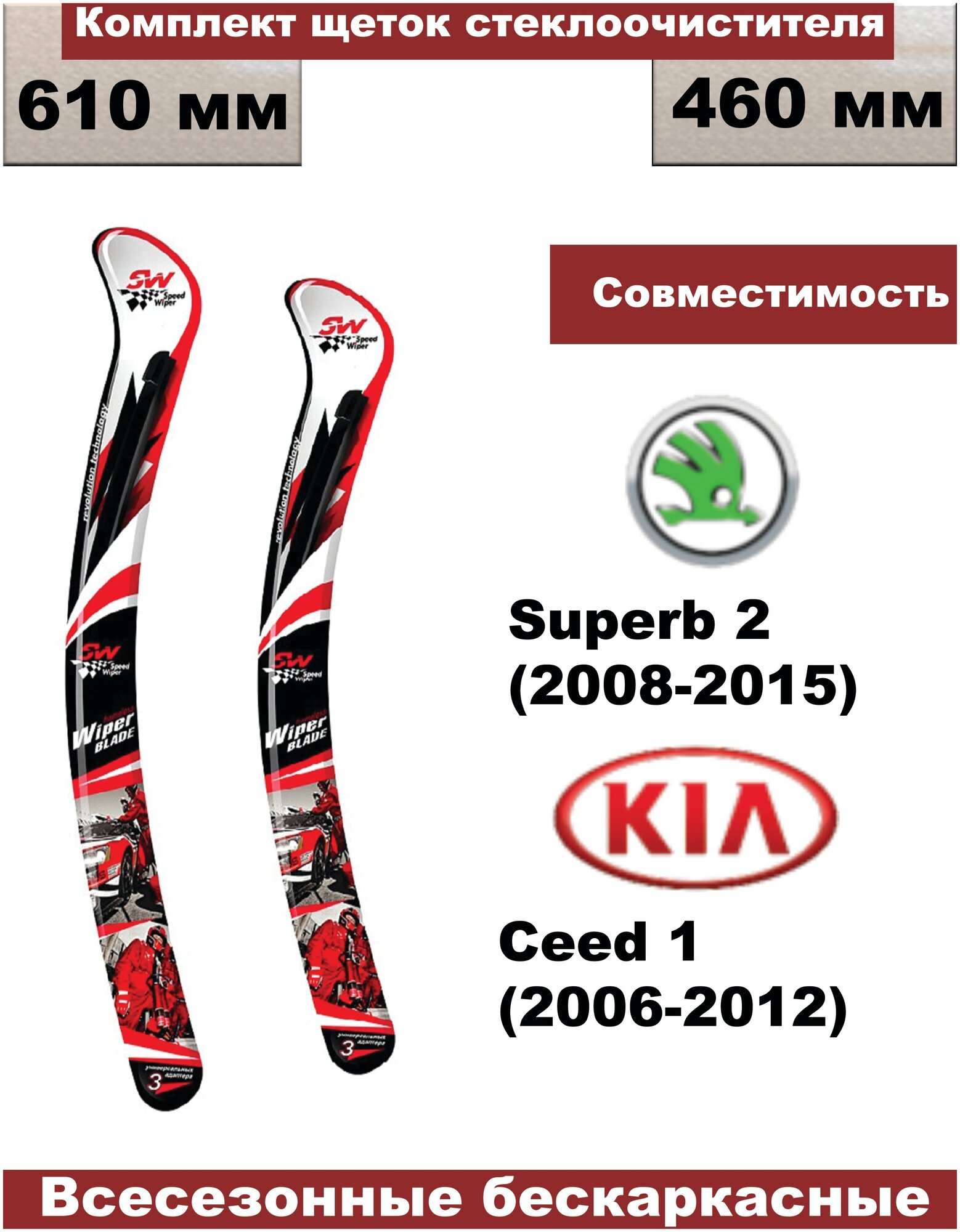 Комплект бескаркасных щеток стеклоочистителей (дворники) premium Шкода Суперб 2, Skoda Superb 2 (2008-2015)/Kia Ceed (2006г - 2012г Ceed 1) - 2 шт. информация: