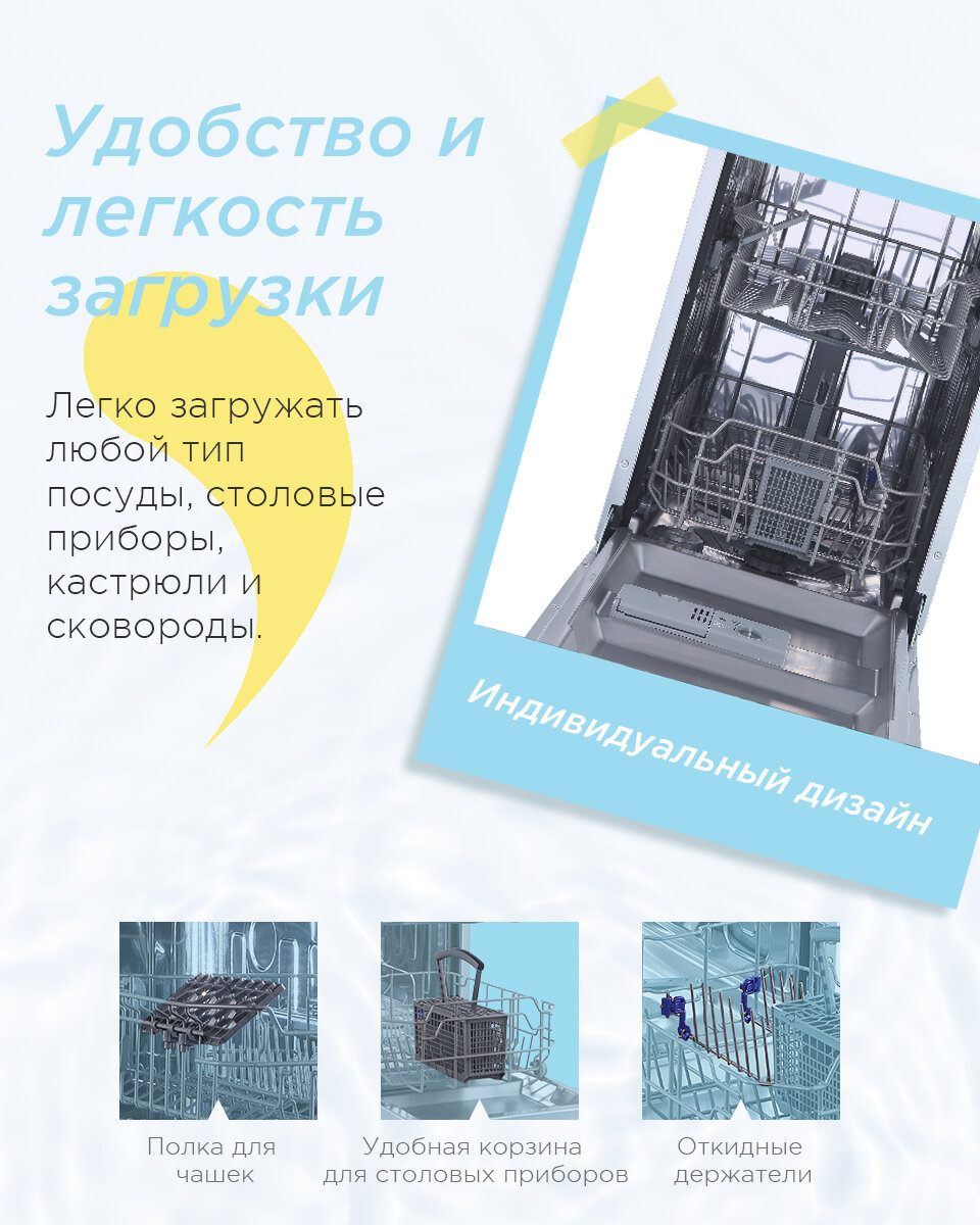 | Особенности конструкции | использование средств 3 в 1 / регулируемая по высоте корзина для посуды / таймер отсрочки |