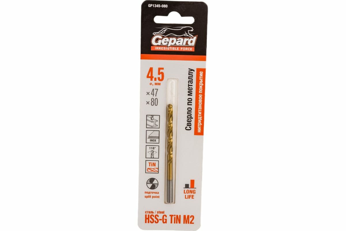 Сверло по металлу ц/х 4.5х47х80 мм HSS TIN GEPARD (нитридтитановое покрытие) (GP1345-080) информация: