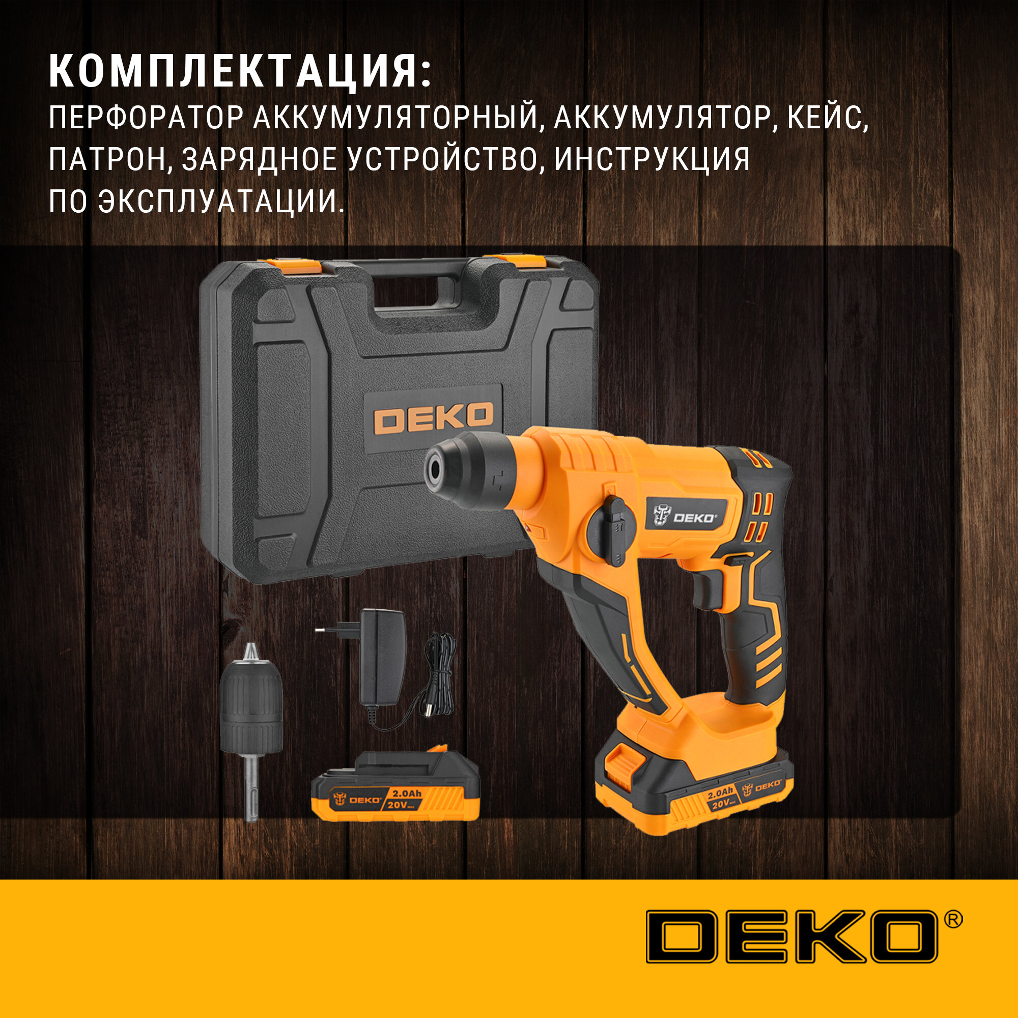 Перфоратор аккумуляторный DEKO DKCH20, 20В, 2x2.0Ач в кейсе с патроном CH02 информация: