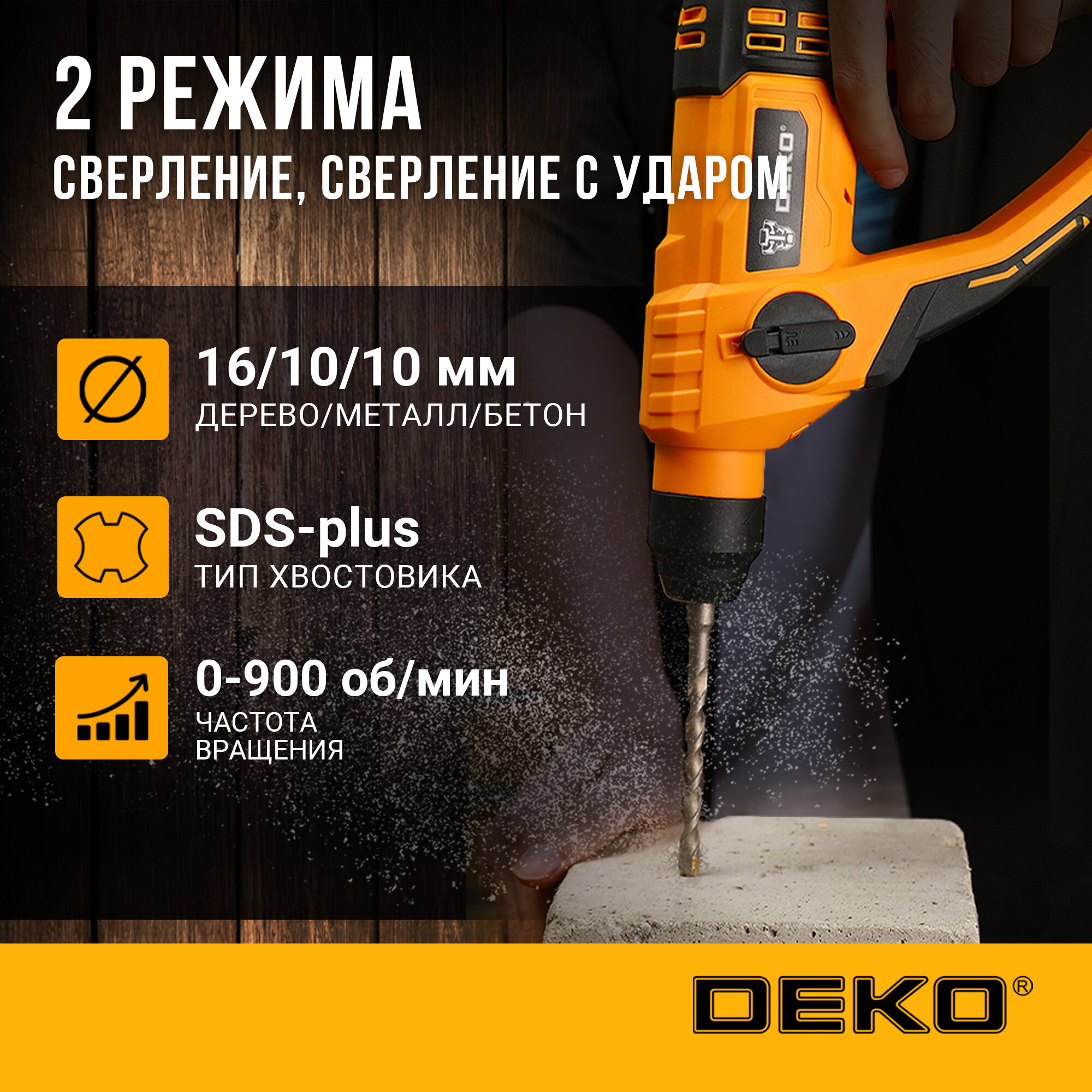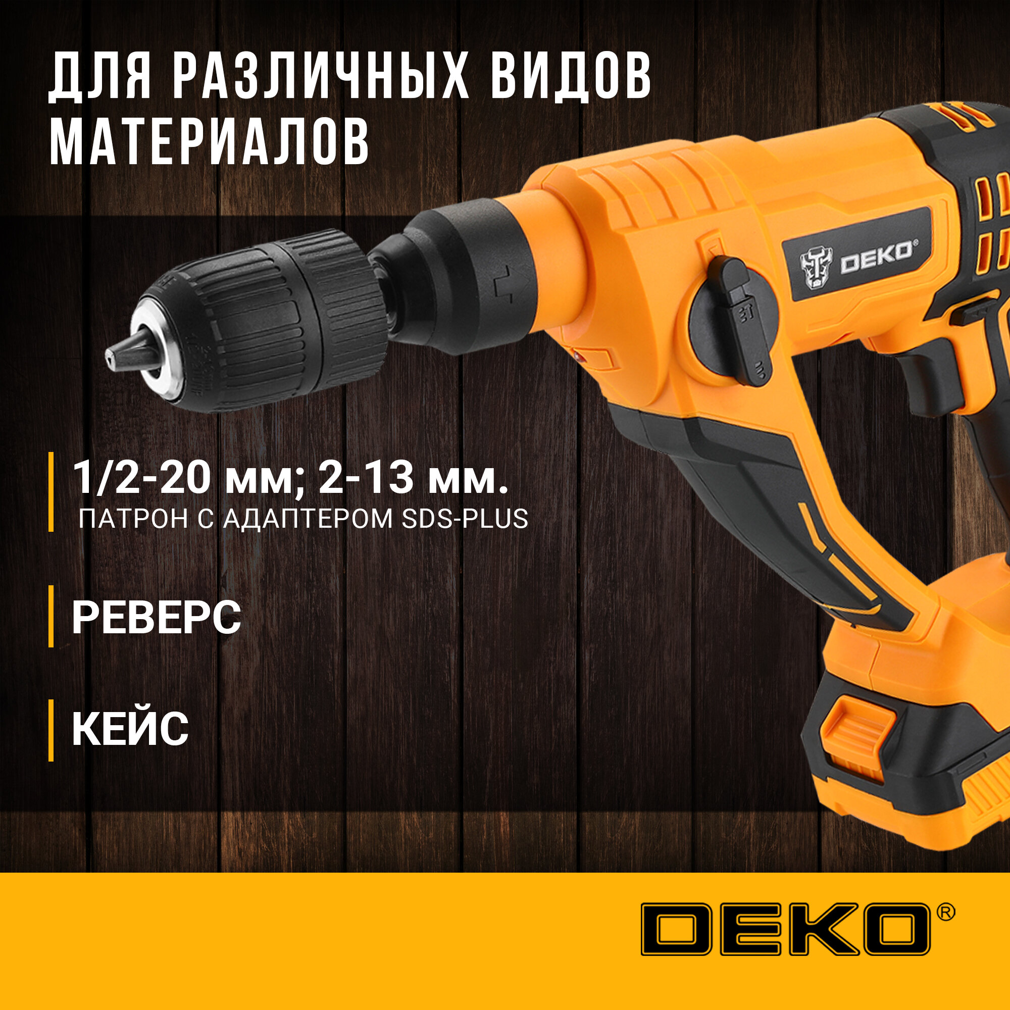 Отзывы на Перфоратор аккумуляторный DEKO DKCH20, 20В, 2x2.0Ач в кейсе с патроном CH02