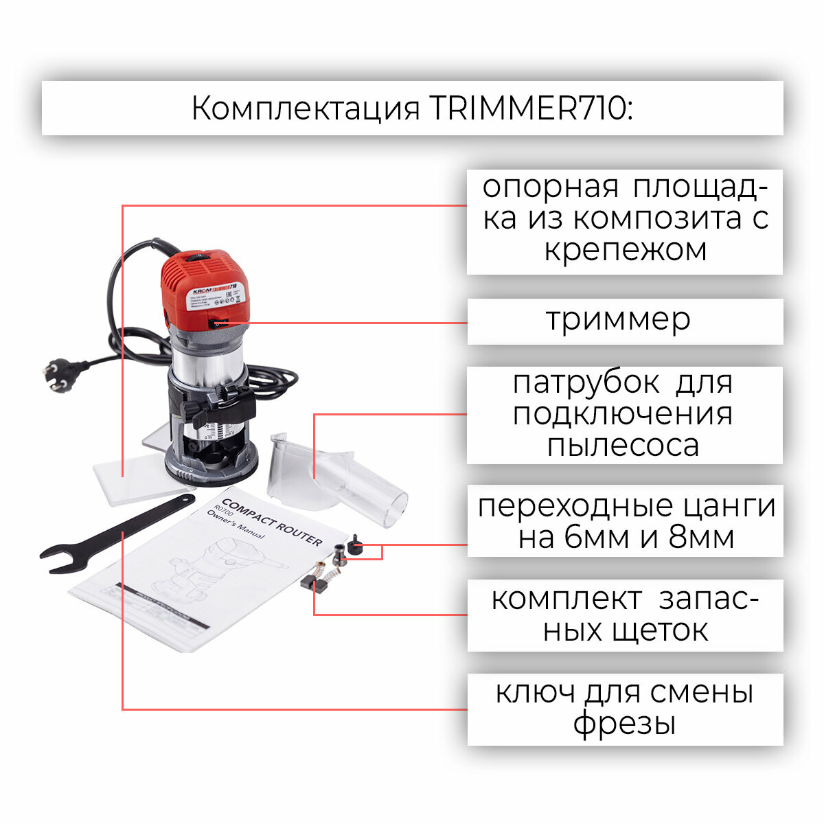 | Комплектация | триммер, опорная площадка из композита с крепежом, комплект запасных щёток, ключ для смены фрезы, переходные цанги на 6мм и 8мм, патрубок для подключения пылесоса |