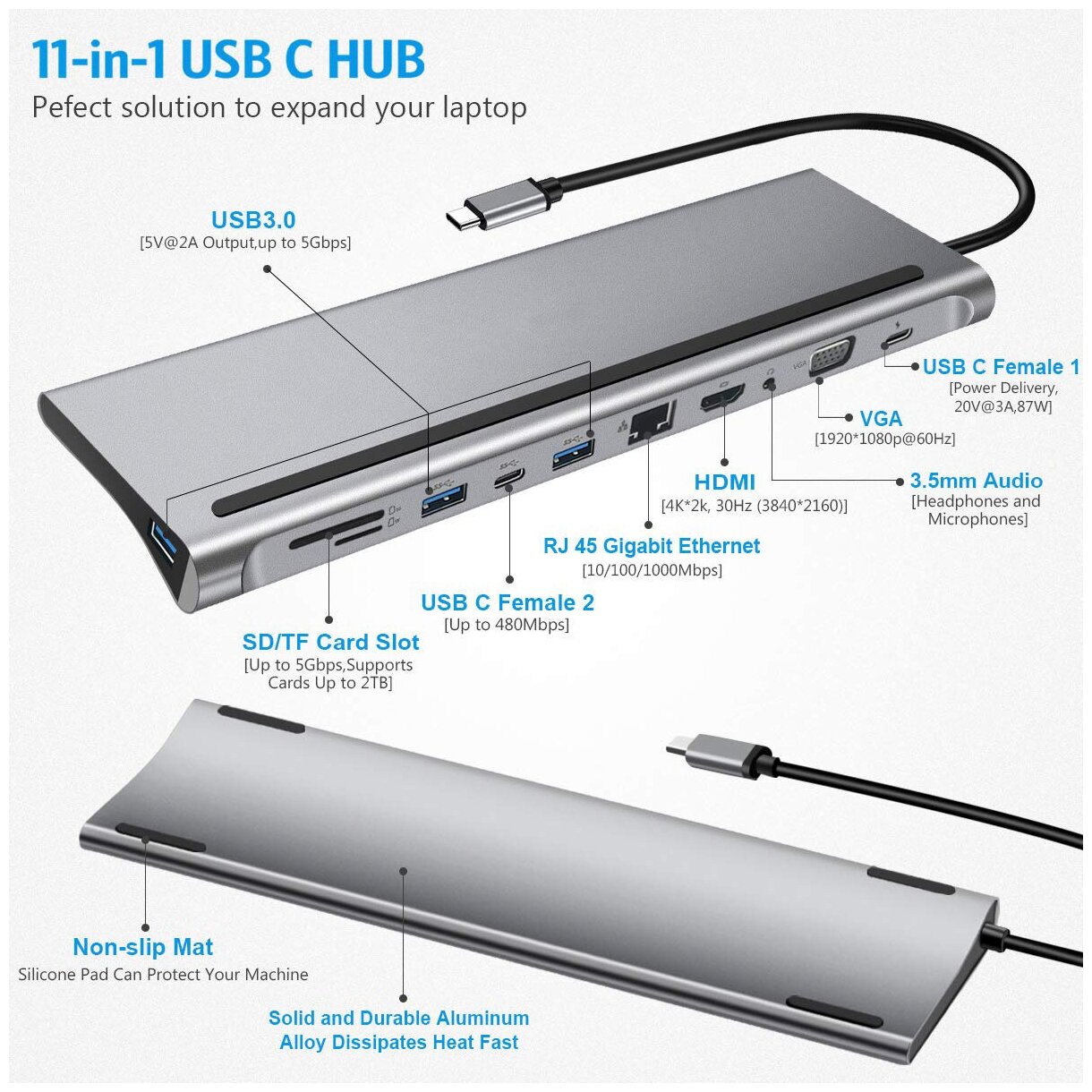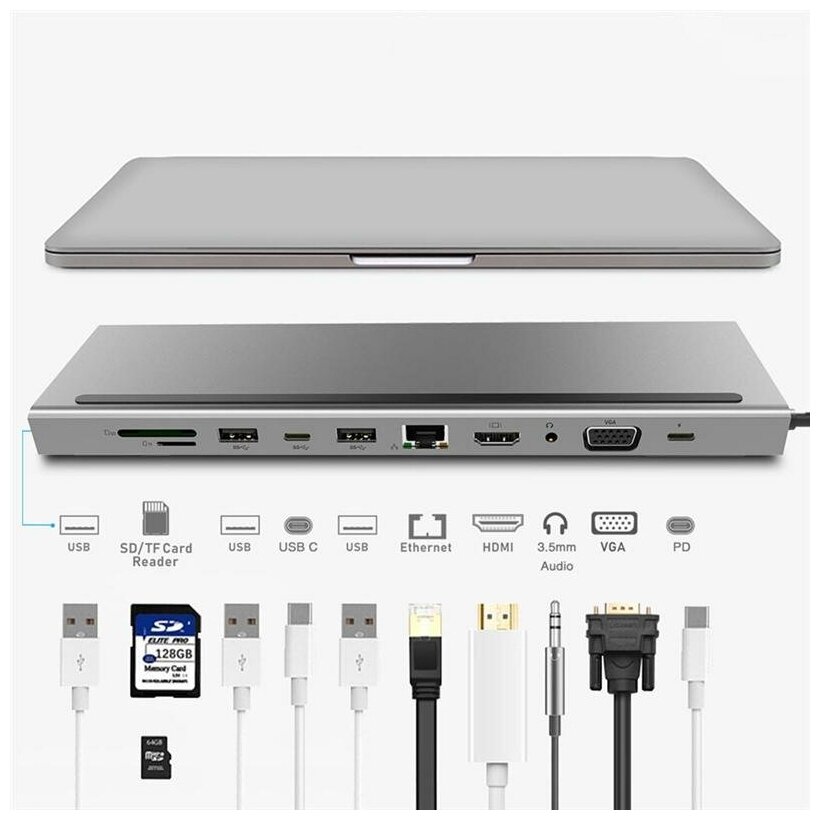 10 цен на USB Type-C HUB ELfoC LM3123-69-11 Супер-комбайн хаб 11 в 1, концентратор USB3.0x2+USB C Data Function+USB C PD+RJ45+HDMI 4K30Hz+VGA+SD+3.5mm Audio