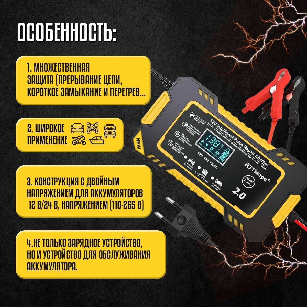 | Функции | автоматическое отключение зарядки / встроенный амперметр / встроенный вольтметр / встроенный фонарь / подходит для AGM/GEL аккумуляторов / режим зимней зарядки |