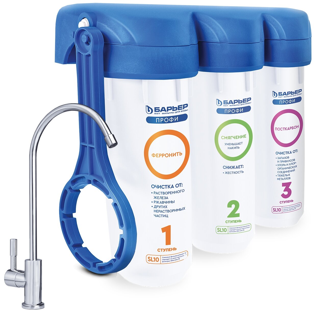 Фильтр под мойку для очистки воды трехступенчатый БАРЬЕР профи Комплекс, защищает от накипи и железа