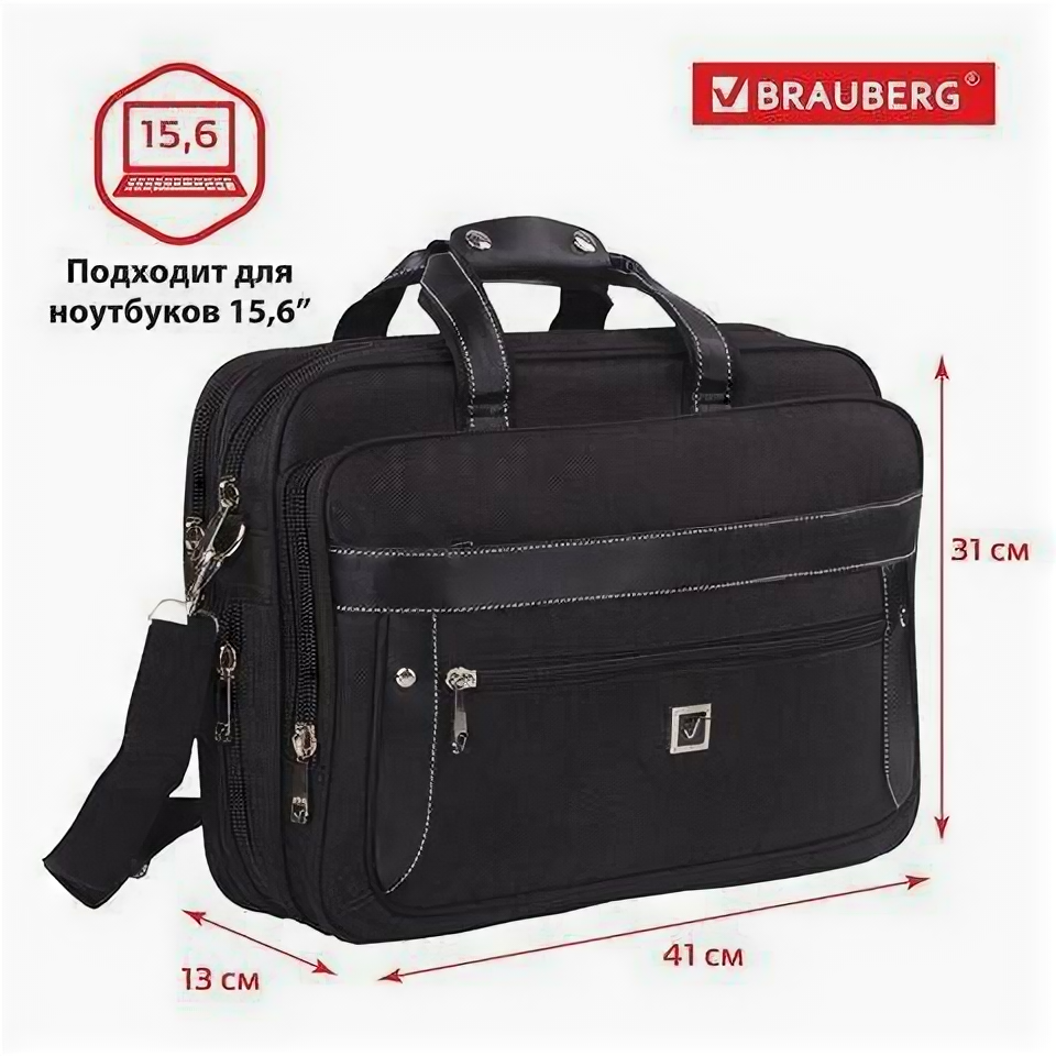 Сумка портфель BRAUBERG CARBON с отделением для ноутбука 15-16", 2 отделения, черная, 31х41х13 см, 240509