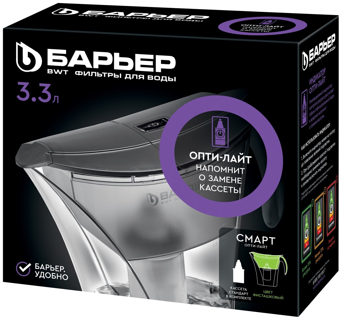 Фильтр-кувшин для очистки воды барьер Смарт c электронным индикатором замены кассеты Опти-Лайт, 3,3 л, цвет фиолетовый