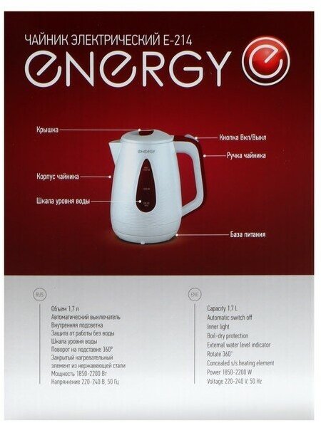 Чайник электрический ENERGY E-214, пластик, 1.7 л, 1850 - 2200 Вт, бело-красный Energy 4412160