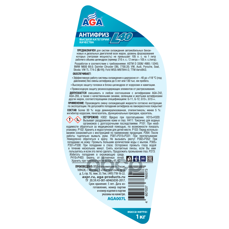 Отзывы на Aga007l_антифриз! Aga-L40, Готовый К Применению, Сине-Зеленый, G-11, 1Кг AGA арт. AGA007L