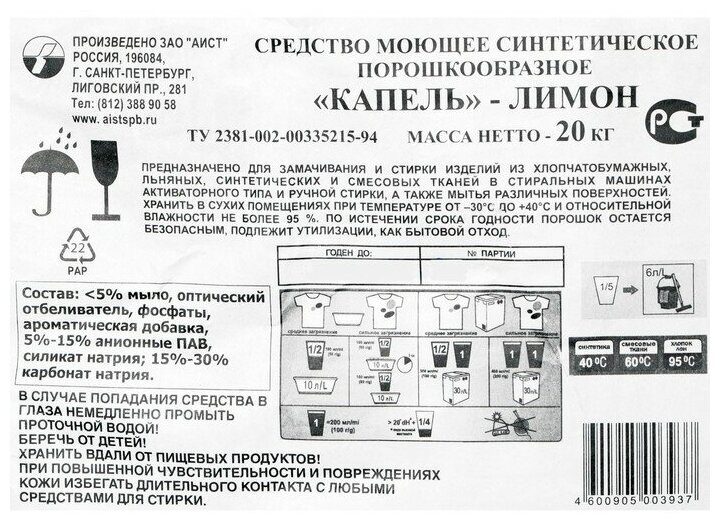 Стиральный порошок "Аист - Капель Лимон",, 20 кг информация:
