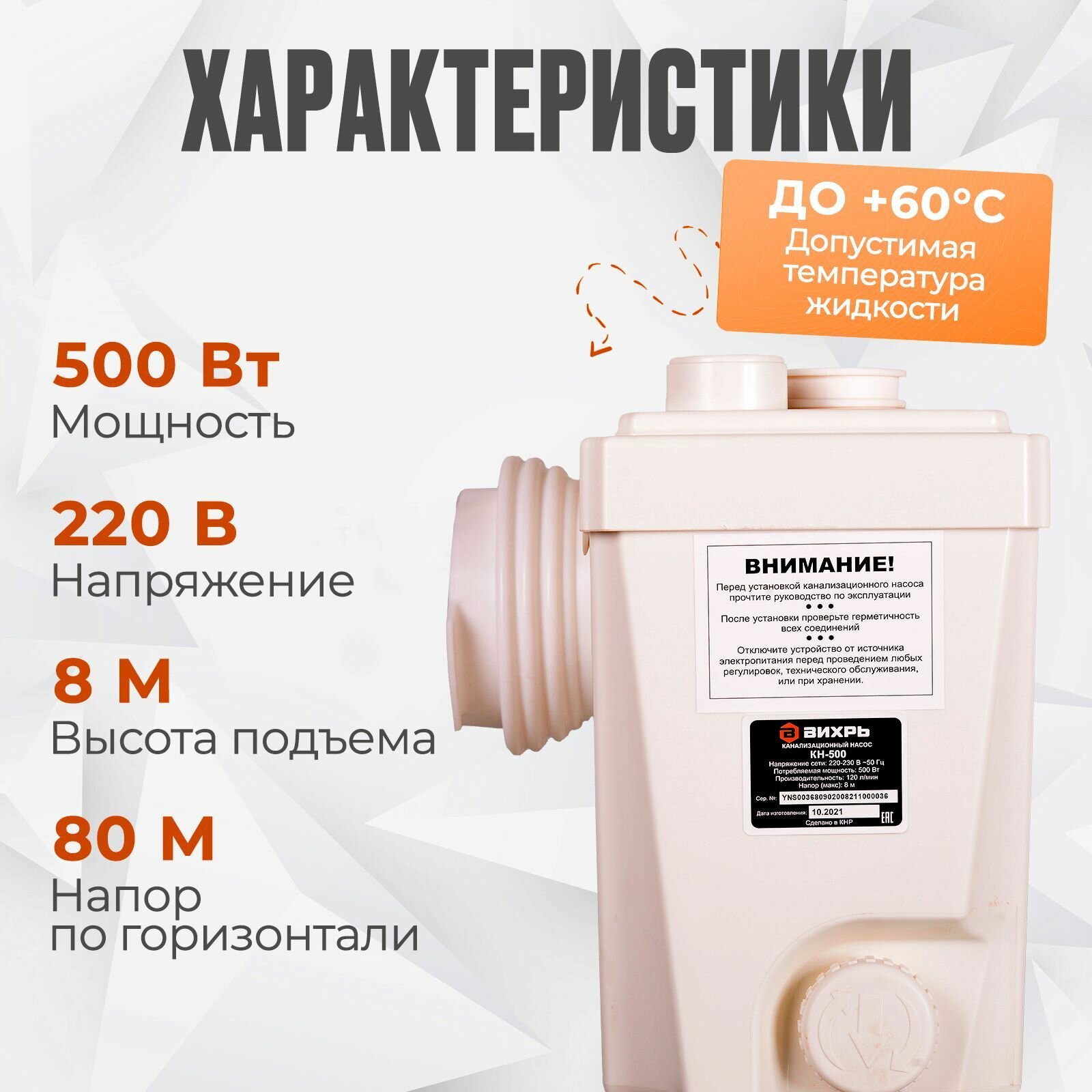 Канализационный насос с измельчителем КН-500 Вихрь (500 Вт, 120 л/мин, макс. напор по вертикали 8 м, по горизонтали 80 м, ножи в наличии) для душа, раковины, кухни, унитаза 18 290 ₽