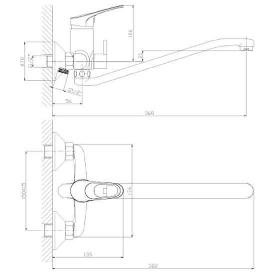 Смеситель на раковину настенный Эверест B46-350 с круглым поворотным изливом, кран-буксы 1/2", хром