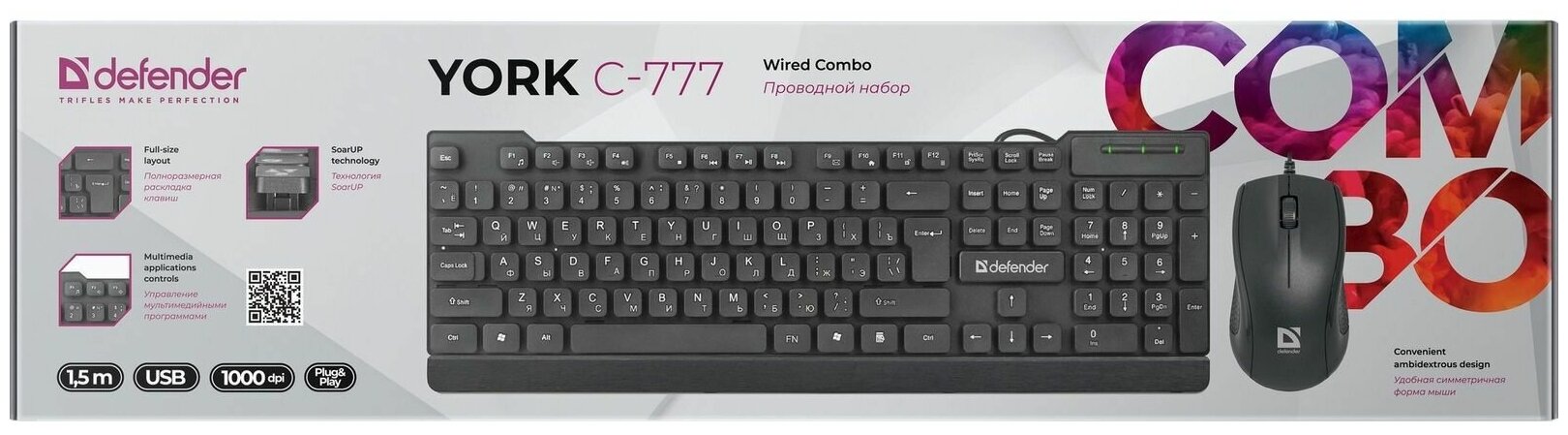 Клавиатура и мышь Defender YORK C-777 RU 45779 черный, 104 шт, 1000 dpi, 1,4м