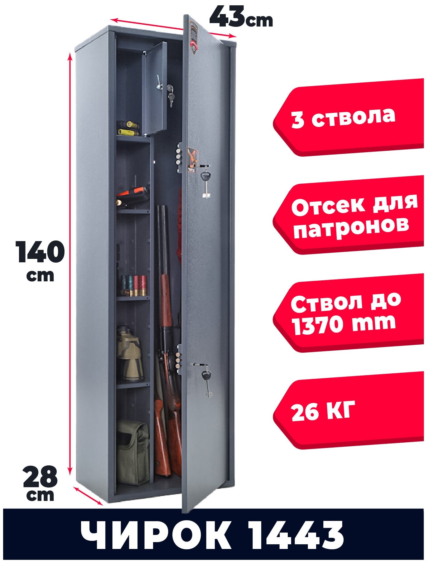 | Дополнительная информация | размер от дна до отделения под патроны-1075 мм; размер отделения отделения под ружья: ширина 248 мм, глубина 250 мм. |