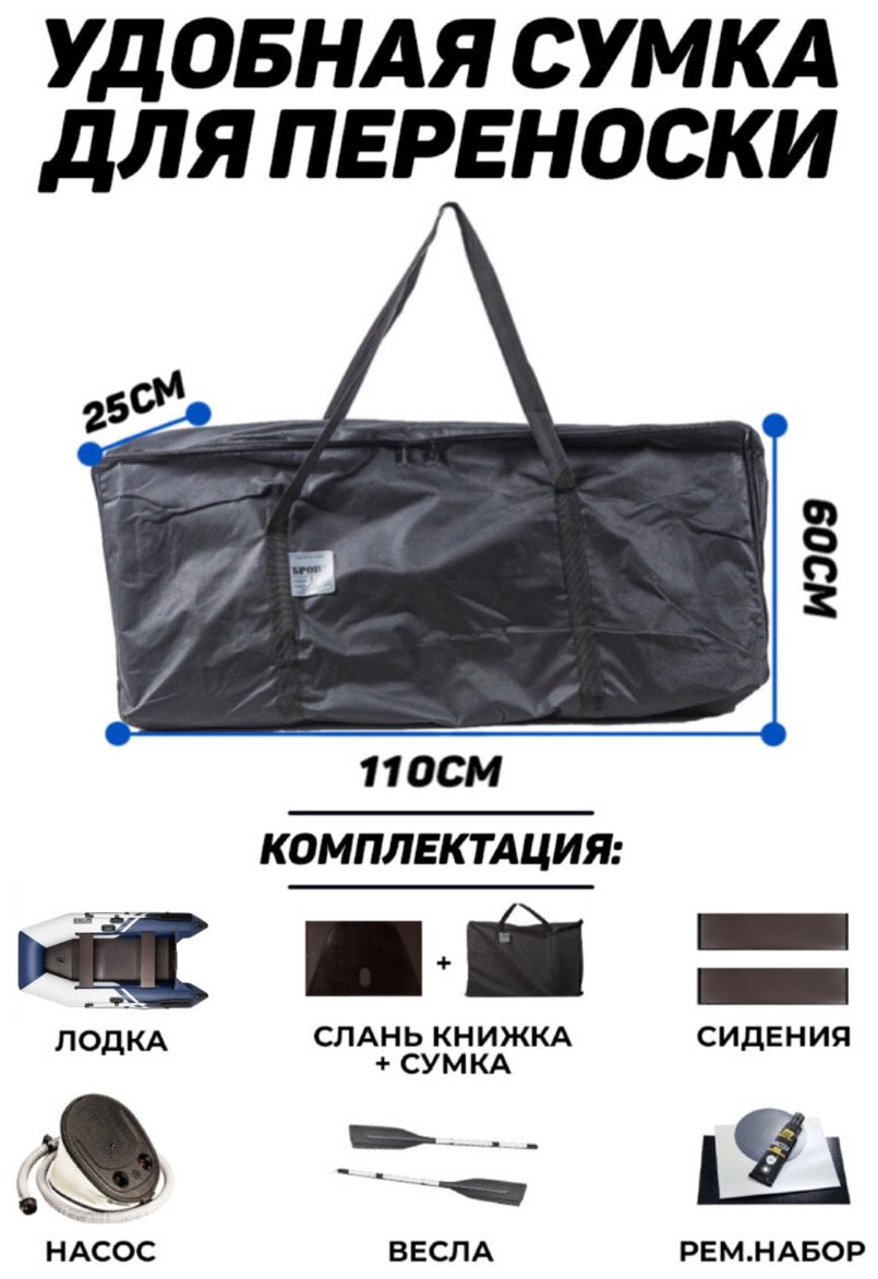 | Состав набора | Лодка, слань-книжка, 2 сидения, 2 весла разборных, ножной насос 5 литров, рем.комплект, сумка для лодки, сумка для слани. |