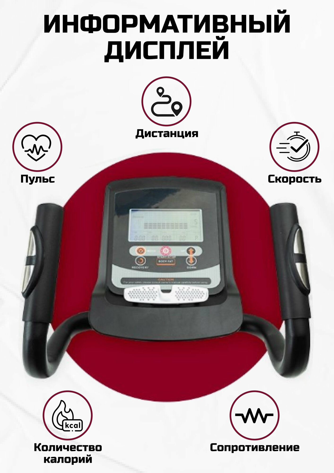 | Показания дисплея | общее время тренировки / пройденное расстояние / пульс / расход калорий / текущая скорость / уровень нагрузки / частота вращения |