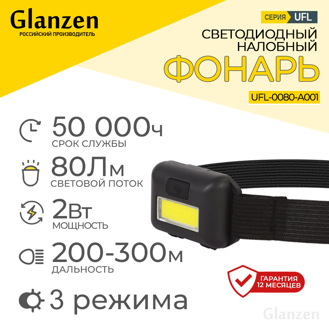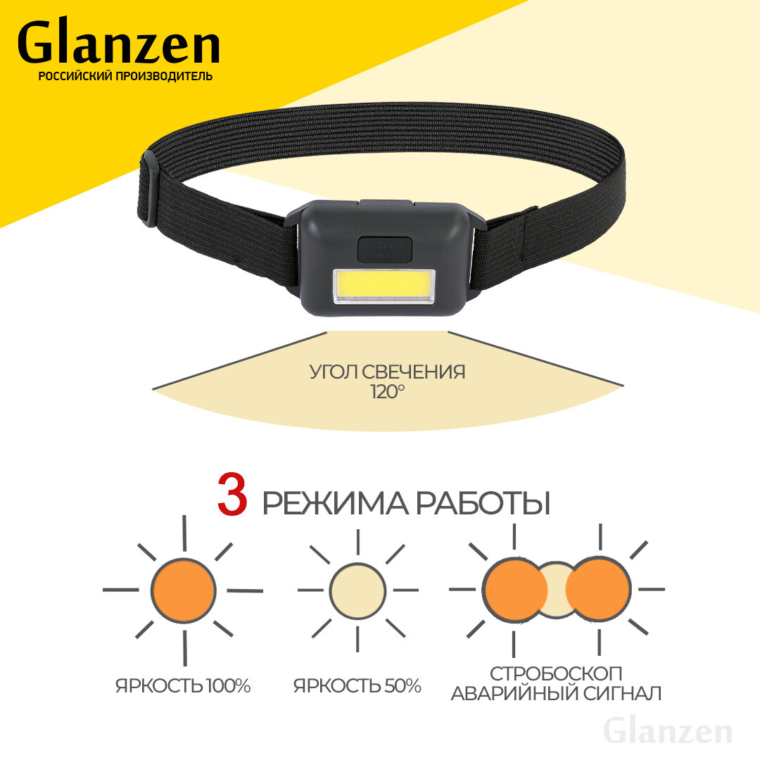 10 цен на Светодиодный налобный фонарь 3ААА GLANZEN 2Вт UFL-0080-A001
