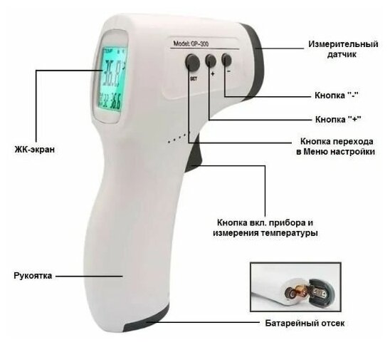 Отзывы на Бесконтактный инфракрасный термометр для измерения температуры человека (русская инструкция, с декларацией и батарейками) GP-300 (М)