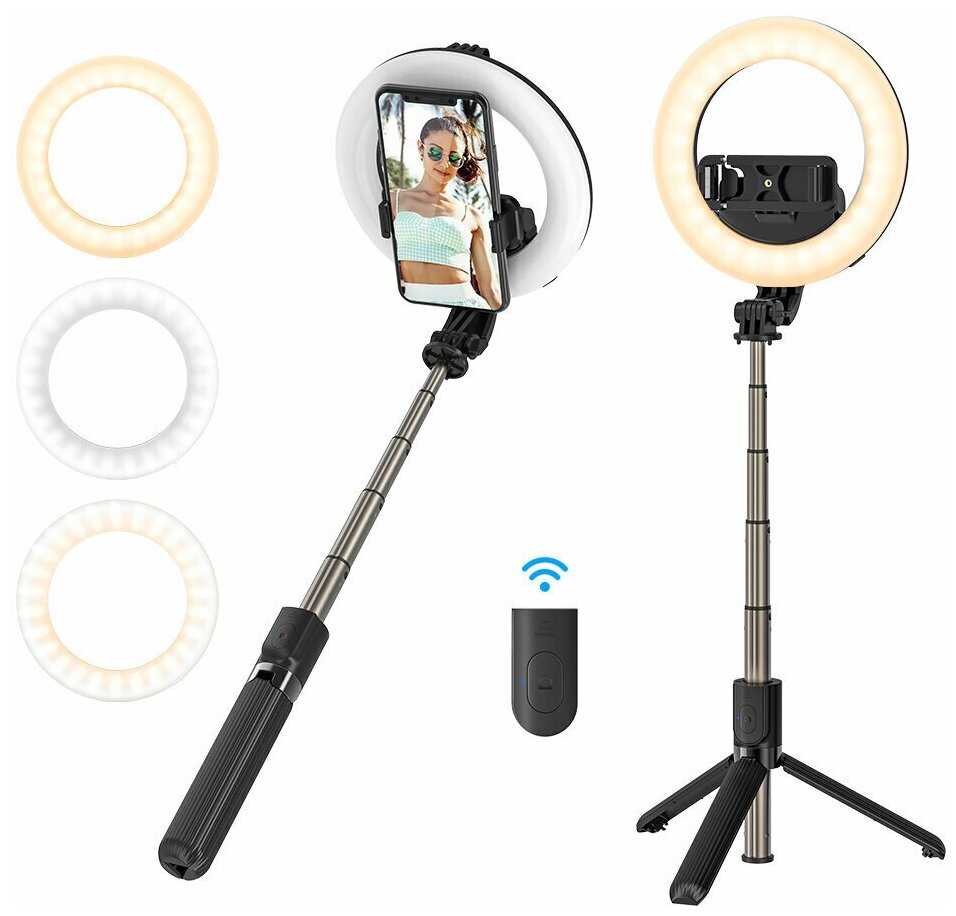 10 цен на Кольцевая лампа со штативом-моноподом и Bluetooth пультом L07 Selfie Stick Tripod 16 см (черная)