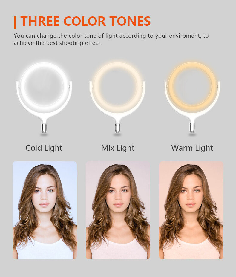 10 цен на Кольцо-лампа для селфи JMARY F-539A, с жестким кронштейном+подставка, USB, белый, зажим, кронштейн