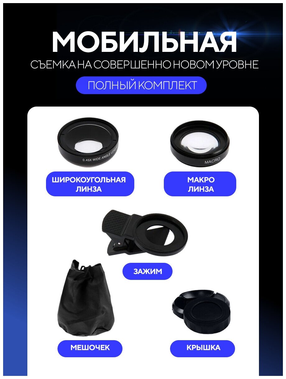 Широкоугольный макрообъектив-линза для телефона 2 в 1, 0.45Х, 37 мм, черный