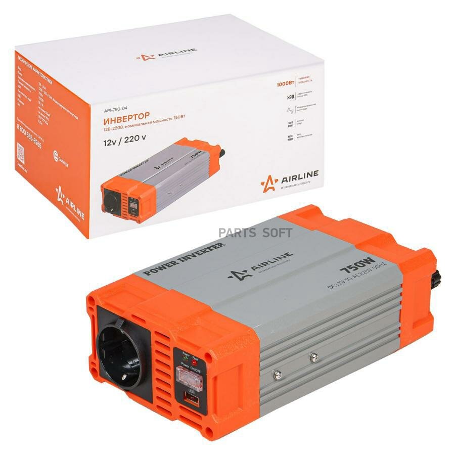 Преобразователь напряжения (инвертор) 12b-220b 750вт (usb+гнездо прикуривателя) (airline) api-750-0... Airline API75004 информация: