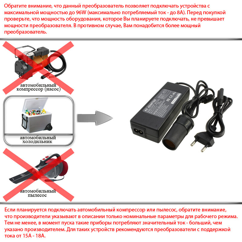Преобразователь питания 220V - 12V, 7.5A (max. 8A), 96W, со шнуром, для подключения автомоб. оборудования к сети 220V информация: