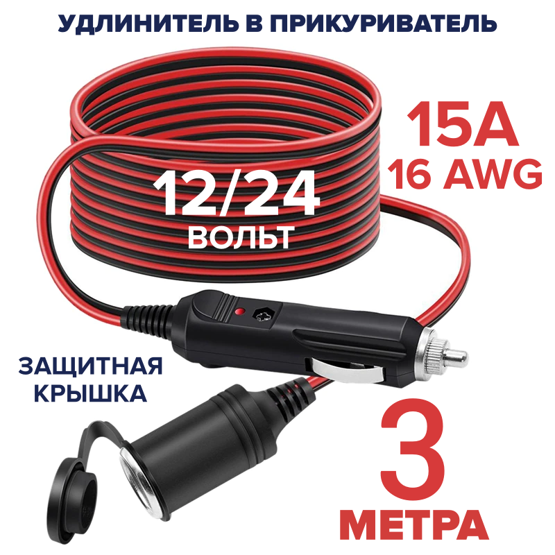 Отзывы на Удлинитель в машину для прикуривателя с защитной крышкой, 12 / 24 Вольт, 3 метра