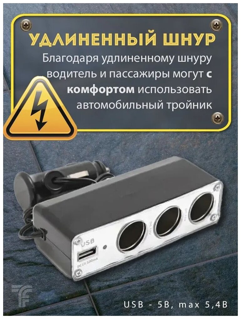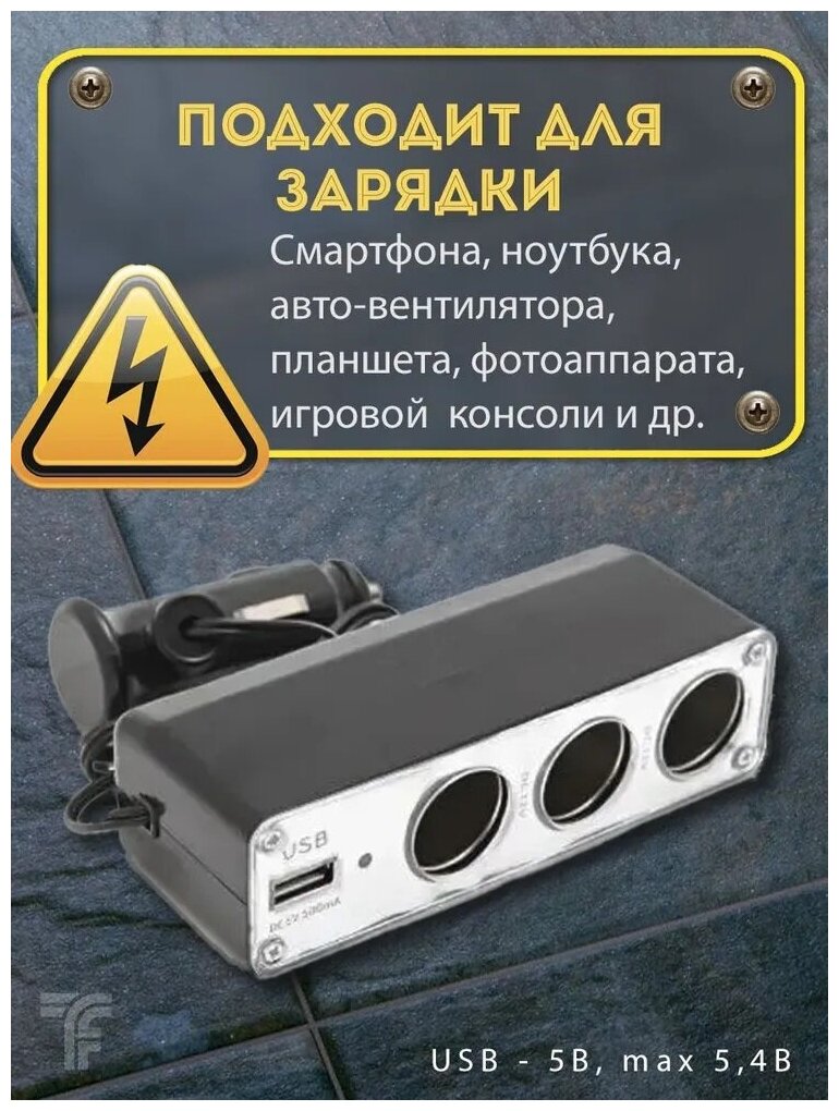 Разветвитель прикуривателя 3 гнезда с USB автомобильный 12В / зарядка в машину для телефона / тройник в прикуриватель авто информация:
