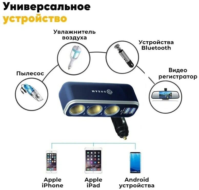 Отзывы на Разветвитель прикуривателя 3 гнезда, 2 USB 3.0 / 3A 5V 60 см провод Dream WF-0963