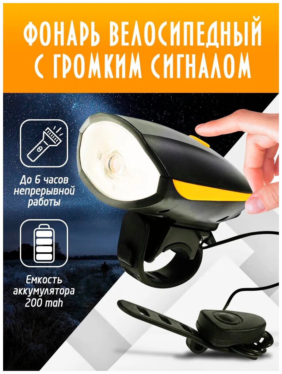 Фонарь велосипедный аккумуляторный с громким сигналом / велофонарь влагозащищенный цвет оранжевый информация: