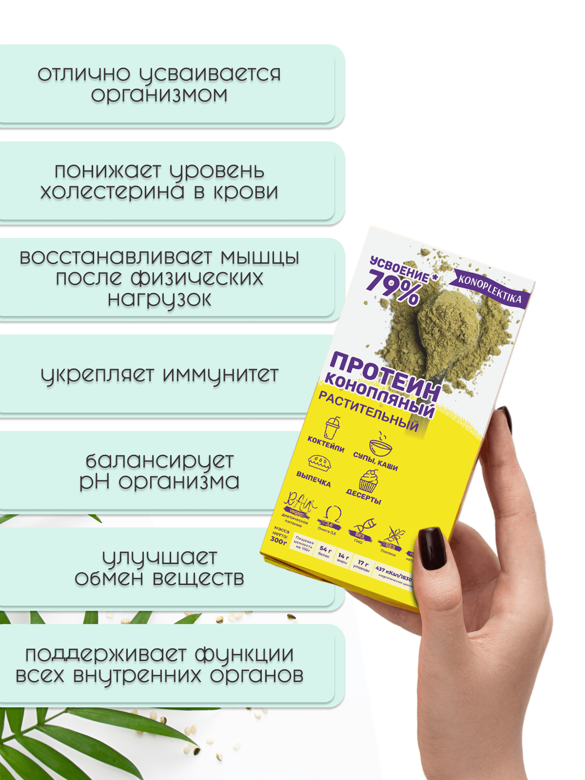 Натуральный белок из семян конопли KONOPLEKTIKA, HEMPGREEN 300 г. / конопляный протеин информация: