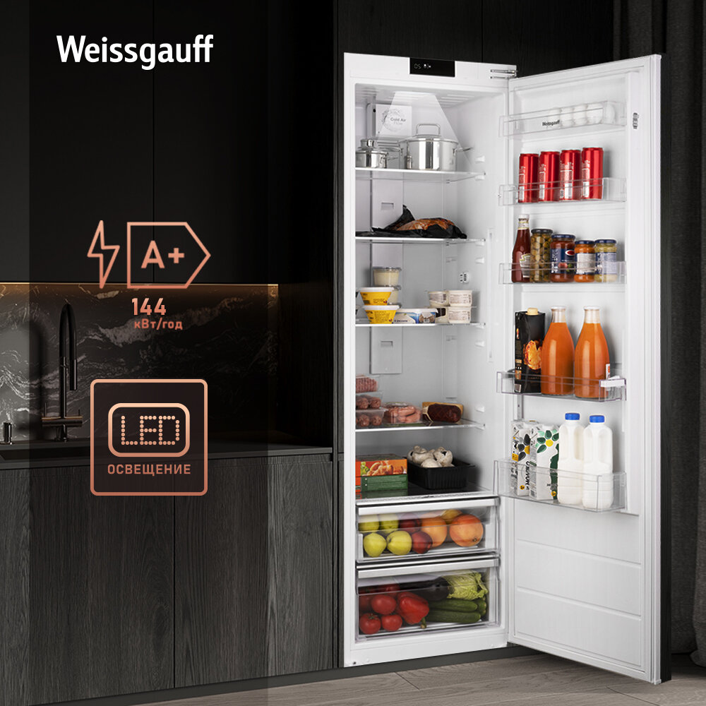 Встраиваемый холодильник Weissgauff WRI 178 Fresh Zone, 3 года гарантии, без морозильной камеры, высота 177 см, ширина 54 см, объем 300 л, зона свежести, полностью электронное управление, супер-режим, LED-освещение, полки из закаленного стекла, А+ 54 449 ₽