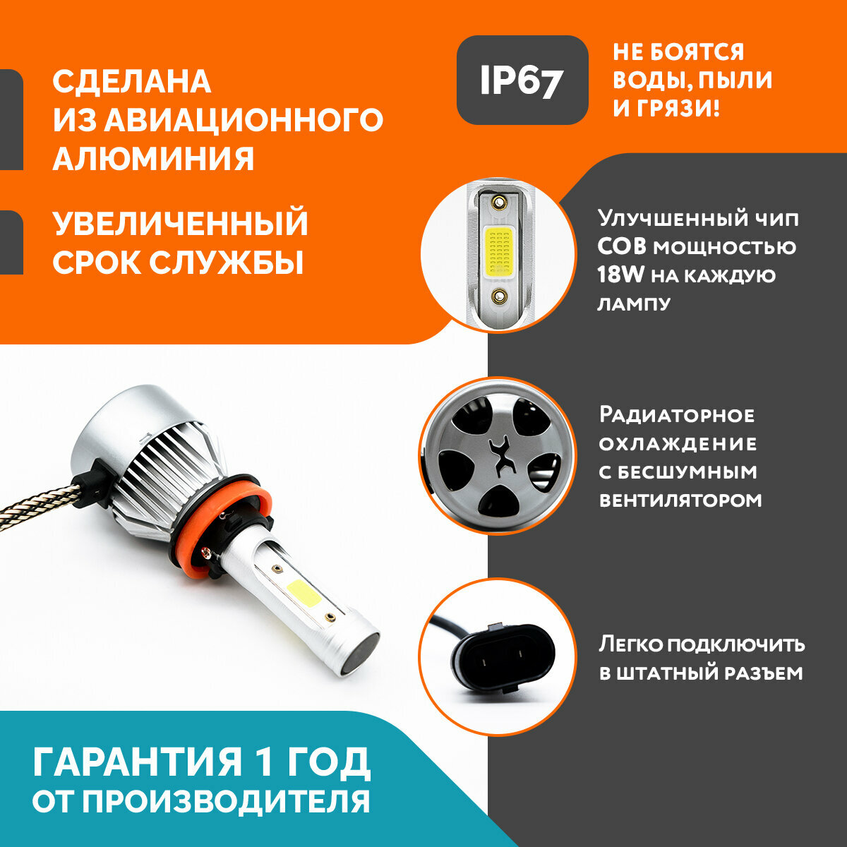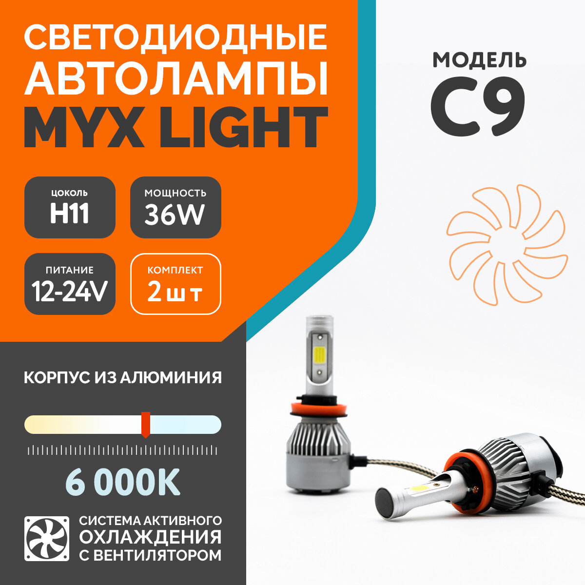 Светодиодные автомобильные лампы MYX Light C9, напряжение 12V, мощность 36W, LED чип COB с вентилятором, температура света 6000K, цоколь H11, 2 шт. информация: