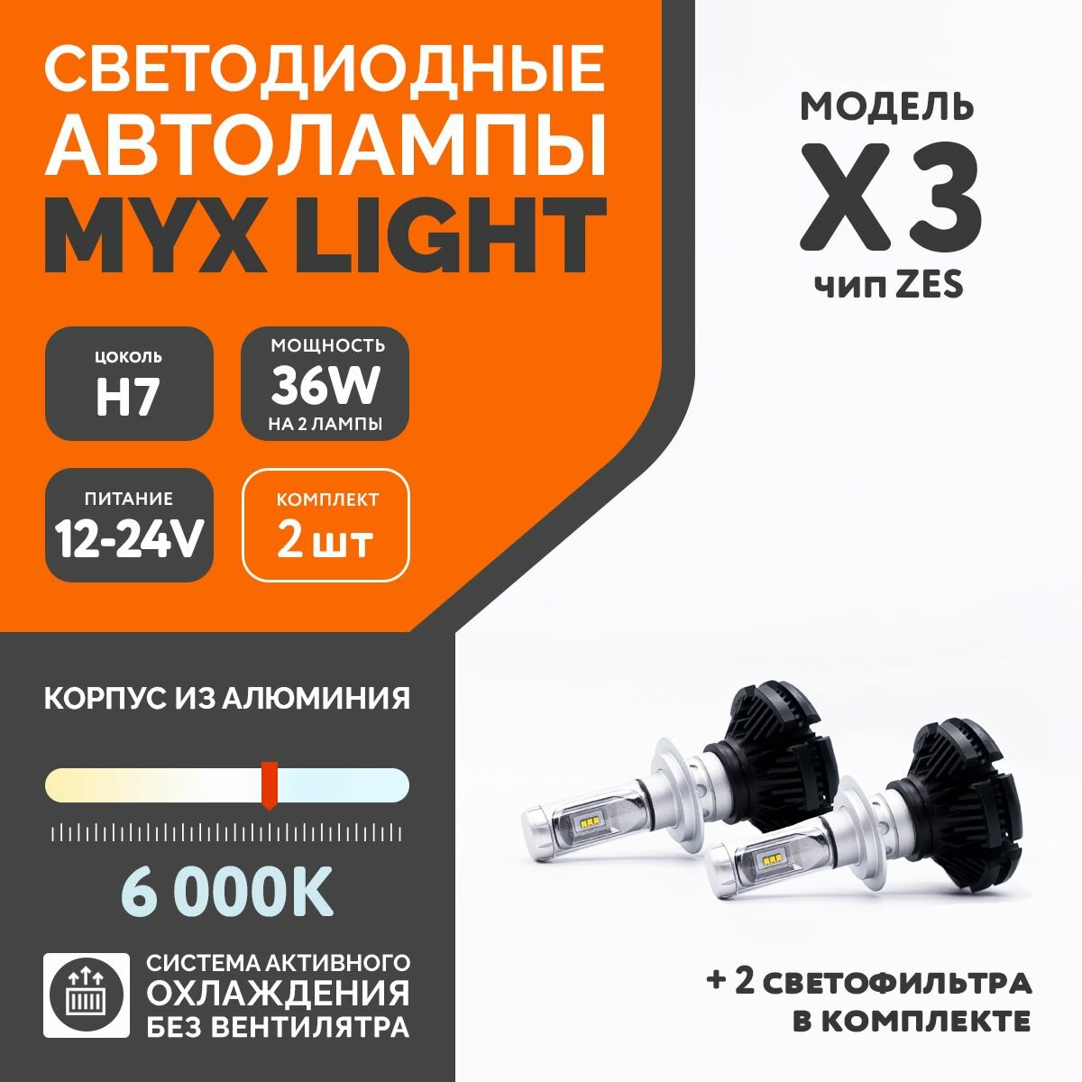 Отзывы на Светодиодные автомобильные лампы MYX Light X3 напряжение 12/24V, мощность 36W, LED чип ZES, температура света 6000K, цена за 2шт., цоколь H7
