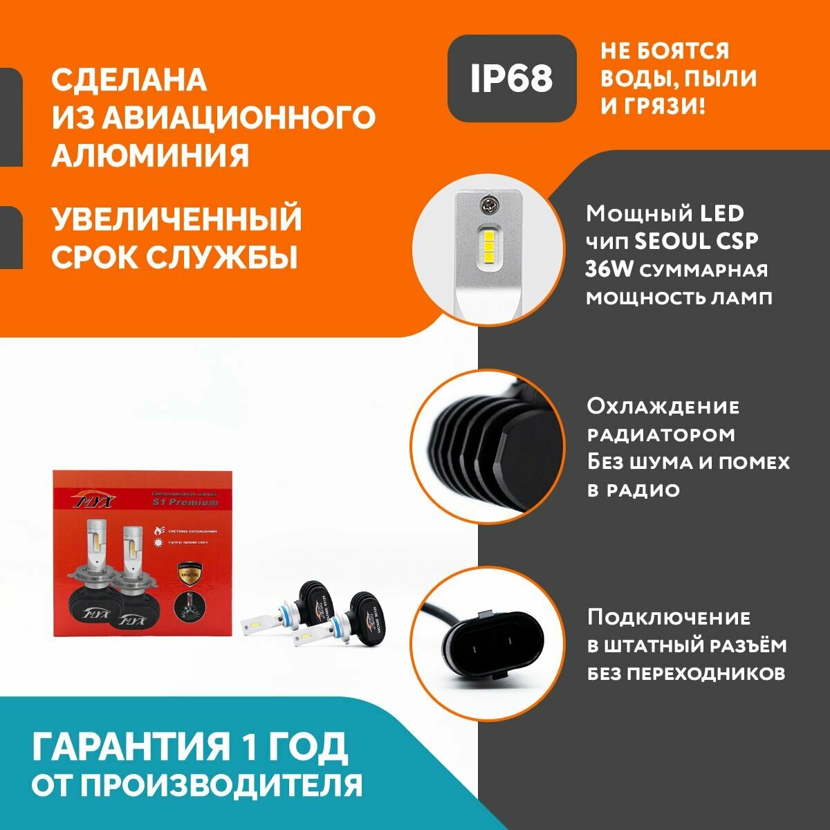 Светодиодные автомобильные лампы MYX Light S1 Premium напряжение 12V, мощность 40W, чип CSP SEOUL, температура света 6000K, цена за 2 шт., цоколь HB4 информация: