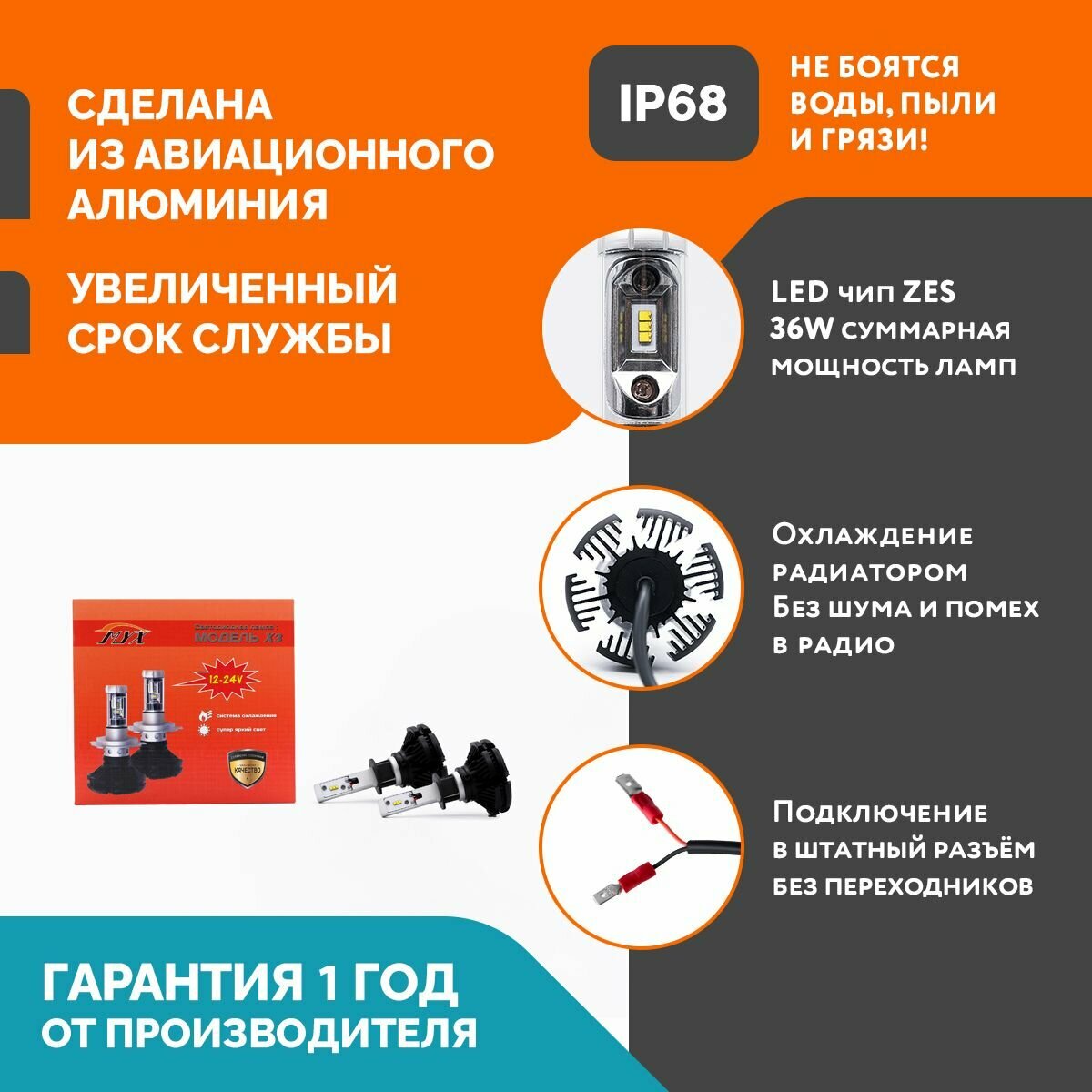 Светодиодные автомобильные лампы MYX Light X3 напряжение 12/24V, мощность 36W, LED чип ZES, температура света 6000K, цена за 2шт., цоколь H1 информация:
