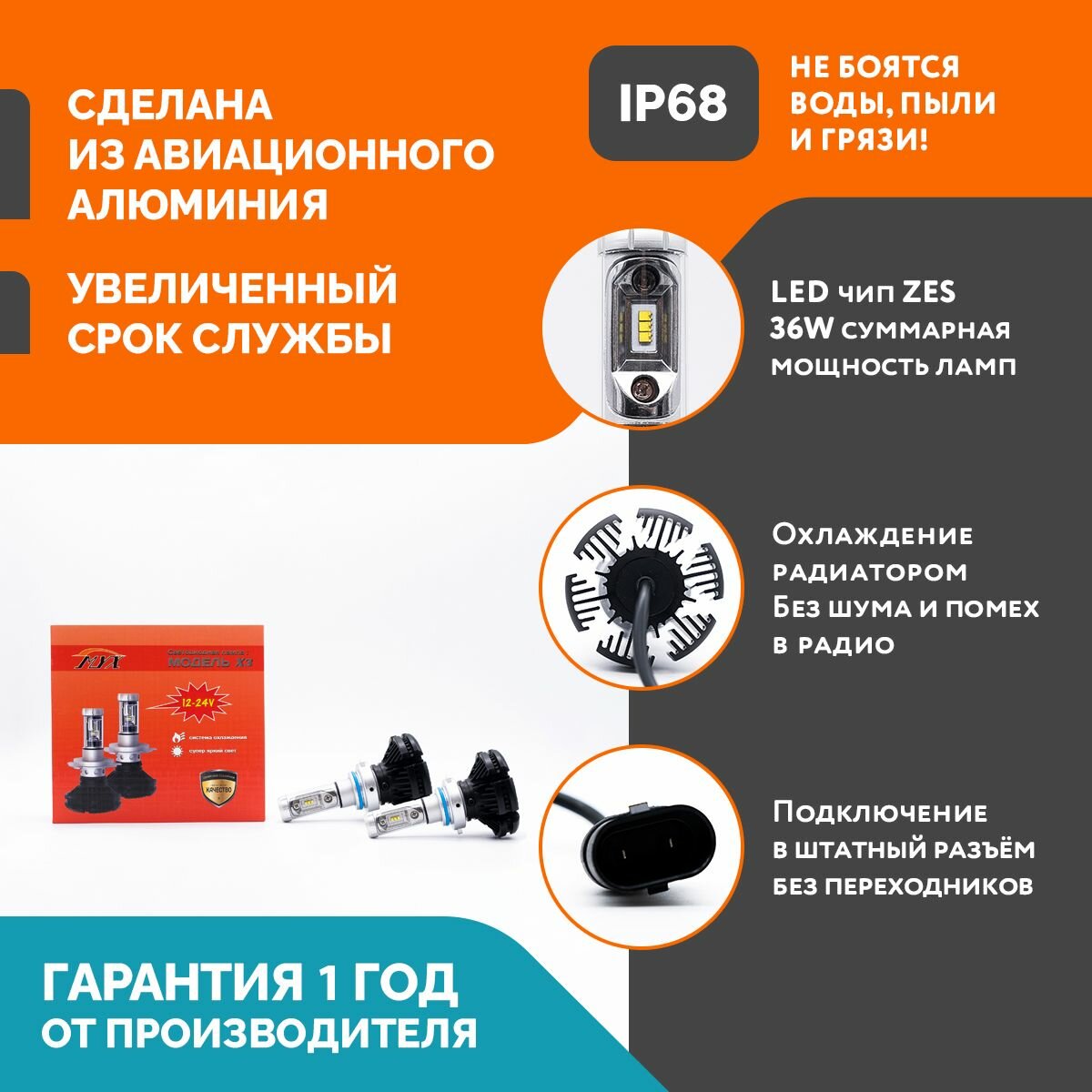 Светодиодные автомобильные лампы MYX Light X3 напряжение 12/24V, мощность 36W, LED чип ZES, температура света 6000K, цена за 2шт., цоколь HB4 информация:
