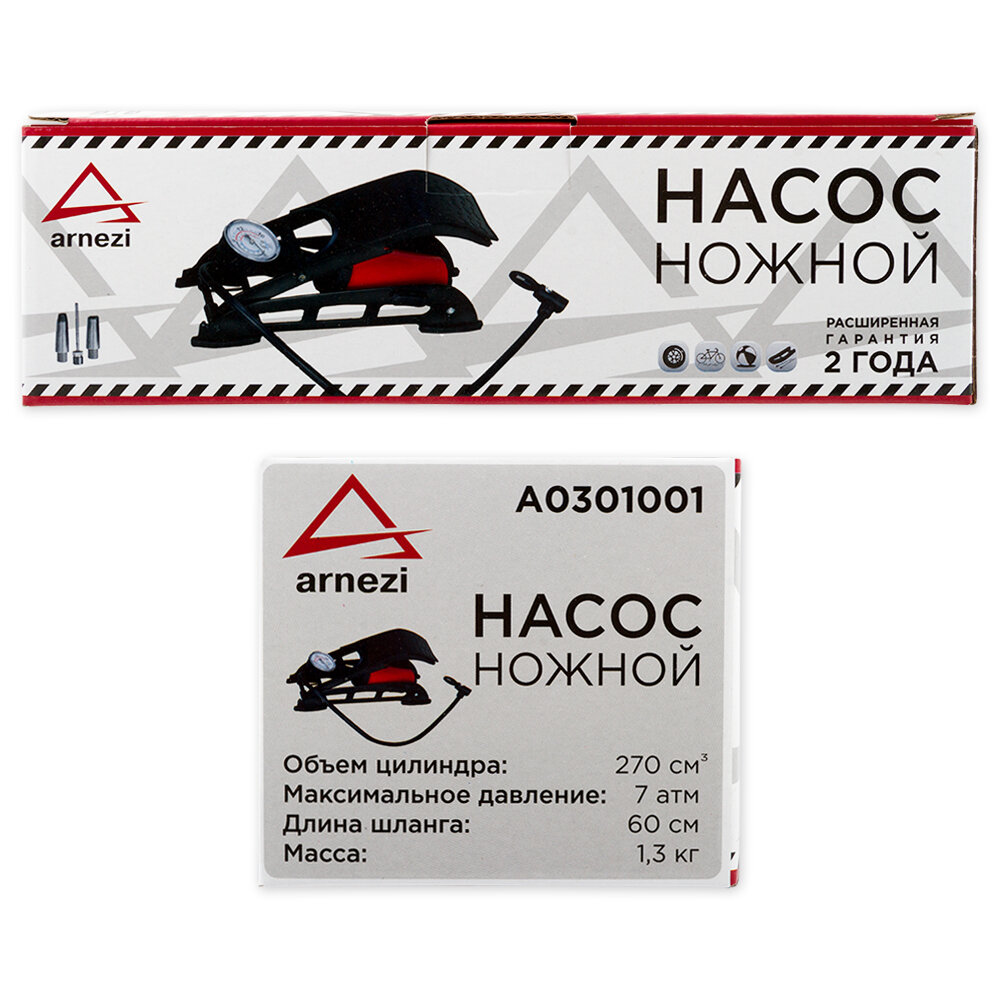 Отзывы на Насос ножной одноцилиндровый 270см3 с манометром 0-7Атм и шлангом L 60см ARNEZI A0301001