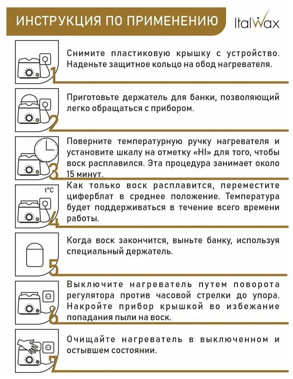 | Способ применения | 1. наденьте защитное кольцо на обод нагревателя; 2. приготовьте держатель для банки, позволяющий легко обращаться с прибором; 3. поверните температурную ручку нагревателя и установите шкалу на отметку «HI» для того, чтобы воск расплавился. Эта процедура занимает около 20 минут; 4. температура будет поддерживаться в течение всего времени работы. 5. когда воск закончится, выньте банку, используя специальный держатель; 6. выключите нагреватель путем поворота регулятора против часовой стрелки до упора; 7. очищайте нагреватель в выключенном и остывшем состоянии. При новом использовании, повторите шаги 1–7. |
