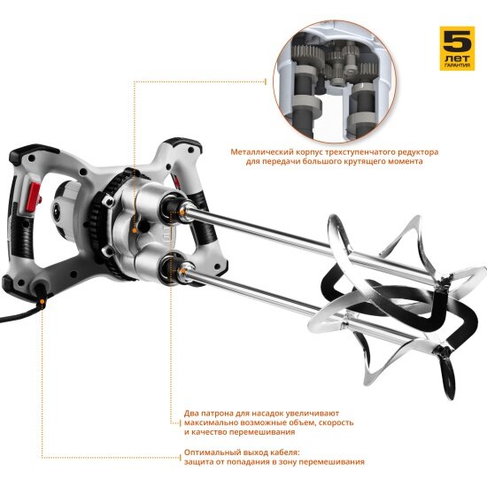 Миксер ЗУБР МРД-1400 строительный, двойной, 1400 Вт, 0-520 об/мин, перемешивание "сверху-вниз"